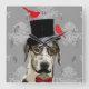 Divertido ilustracion de perro al estilo steampunk en un sombrero de punta y una corbata de arco tiñe el collage digital en un fondo de damasco gris vintage, y pájaros rojos. Para encontrar productos y caracteres animales más humorísticos, visite el VINTAGEPRINTSTORE.