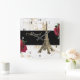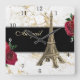 This beautiful Eiffel Tower wall clock design features a golden graphic of the Eiffel Tower on a black, white and gold marble background with red roses. Personalize with a name!