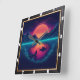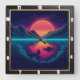 Este ilustracion presenta un fondo de cuero de color neón oscuro con un hombre pescando en un bote en un lago. La escena se pone al atardecer, con cálidos tonos naranjas y amarillos que contrastan con los frescos tonos azules y verdes del lago y las montañas. La textura estilizada y grabada crea una impresión única y artística. Las aves vuelan en el cielo, y los peces son visibles en el agua, lo que añade a la atmósfera serena pero detallada.
