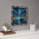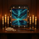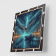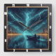 Un ilustracion impresionante representa a una persona pescando desde un bote en un lago bajo un cielo vivo con un fuerte rayo. El diseño se caracteriza por sus colores eléctricos y vibrantes y un fuerte sentido de energía. El reflejo del rayo en el agua y el resplandor de los peces aumentan el efecto dramático.