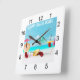 Tres pimientos rojos en la playa. Días soleados, mar azul, arena blanca, paraguas y sombreros. Dos pimientos son somnolientos bajo las sombrillas, el tercero tiene una profundidad de cintura en el agua. Cada hora es feliz en la playa. Sol, mar, arena, Sombrero. Divertido uno de los bonitos relojes cuadrados de pared.