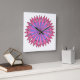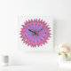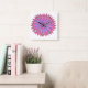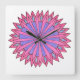 A wall clock with a pink and pale blue flower design on the face features a Aztec-inspired aesthetic, with a white background to highlight the bold, abstract flower design.