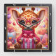 This adorable square wall clock features a heartwarming digital illustration of a baby giraffe wearing pink heart-shaped glasses and a cozy magenta turtleneck sweater. The giraffe is shown holding a beautifully wrapped pink and white plaid gift box with a large satin bow. The background is a whimsical, soft-focus room filled with Valentine decor, including hanging heart ornaments, plush pillows, and a glowing candle, creating a warm and festive atmosphere. The artwork is framed by a modern black wood-textured border with bold white numeric markers for easy timekeeping. This functional piece of home decor is a perfect gift for animal lovers, Valentine Day, or as a charming addition to a nursery or office. The rich, vibrant pink tones and sweet character design provide a cheerful and loving focal point for any interior space.