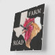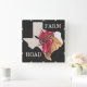 Los caminos de granjas y ranchos cubren el gran estado de Texas, y los carteles que marcan esos caminos son un paisaje familiar. Este signo combina ese texto con la forma de estado rellena con un pollo acuarela y cercas de alambre. El fondo es una mezcla texturada de grises oscuros. Consulte otras opciones con una vaca, un caballo o un cerdo. Productos a juego disponibles.