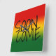 Los colores tres-entonados famosos de la raya sinónimos con la cultura jamaicana crean el fondo perfecto para la frase jamaicana en mayúsculas, PRONTO VIENEN.