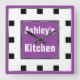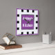 Modern 10.75" x 10.75" wall clock with purple and black squares, personalized with your own text, and a perfect custom touch for any kitchen, bedroom, dorm room, etc.