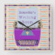 Este reloj de pared cuadrado bonito para los escritores/los novelistas/los periodistas creativos y cualquier otra clase de autor tiene un dibujo púrpura bonito de la máquina de escribir en él. El vintage 60s - la máquina de escribir del estilo tiene un corazón en el centro y su de papel dice, "[su nombre] 'el sitio de la escritura de s." El fondo tiene una pluma ligera de la tinta el repetir del modelo con una acuarela/un efecto pintado.
