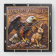 This highly dimensional square wall clock features a unique illustration of a powerful brown raptor (eagle) with focused eyes and a white, happy rabbit sitting closely together. The entire design is rendered in muted brown, tan, and dark leather-like tones, strongly suggesting a deep sculpted relief or Sculpted Leather Look. The eagle is perched on the left, displaying detailed head feathers, while the rabbit is on the right, smiling with long ears and textured fur. They are surrounded by an elaborate circular wreath of gnarled, dark tree roots and stylized leaves carved into the perimeter. The background is a dark, heavily textured leather panel. The large, three-dimensional embossed text "BESTIES FOR LIFE" is carved across the top center in a bold, golden serif font. The clock face features a simple clock face border with large, white, numbered tick marks (1 to 12) integrated into the outer frame. The artwork is surrounded by a thick, dark brown decorative border that resembles a black wood frame.