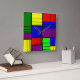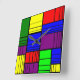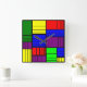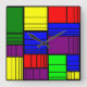 Este reloj de pared tiene un diseño Bauhaus de rectángulos divididos en piezas cada vez más pequeñas en rojo, amarillo, azul, verde, morado sobre un campo de negro.