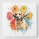 Vibrantes toques de color rodean a un alegre recuperador dorado, cada uno de ellos con una huella de pata en tonos rojos, azules, naranjas y amarillos sobre un fondo blanco