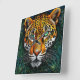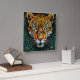 Un retrato llamativo y muy detallado de un leopardo. Su rostro domina la composición, mostrando un pelaje naranja vívido con manchas negras. Los ojos del leopardo son un verde esmeralda intenso, lo que llama la atención de inmediato. Alrededor de él hay un fondo verde exuberante lleno de hojas y vegetación, lo que realza la atmósfera salvaje y vibrante de la pieza. La habilidad artística general enfatiza la belleza y majestuosidad del leopardo, creando una presencia cautivadora y poderosa.