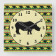 Rinocerontes negros y amarillos marchan a través de rayas verdes alternando con rayas ligeramente "tejidas" en colores de inspiración africana de rojo, negro y verde con acentos amarillos en el patrón que embellece este reloj de pared junto con una silueta de rinocerontes y números negros sobre un fondo amarillo pálido.