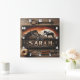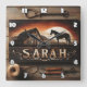 Un cartel de madera muy bien diseñado muestra el nombre de Sarah, con una silueta de caballo y un granero sobre un vibrante fondo de puesta de sol.