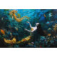 "Seraphina" - Hermosa Sirenita Mística. Paisaje acuático: En este entorno submarino sereno surrealista, una hermosa sirena con una cola dorada muy bien decorada se encuentra en el fondo marino, su cabello rizado en la corriente de un impresionante mar azul. Las criaturas marinas circundantes, incluyendo un pulpo humano inquisitivo y peces vibrantes, añaden vida a la escena. Los sutiles tonos multicolores y los detalles intrincados del estilo prerapelita hacen que este sea un cuadro cautivador y relajante.