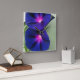 The image on the square, floral wall clock consists of delicate and vibrant twin pink-purple Morning Glory wildflowers on a bed of greenery.