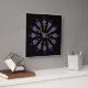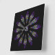 A lovely stained glass pattern adorns this wall clock in dominant colors of purple, blue, yellow and black. Twelve abstract feathers circle a central mask to form a spiritual mandala design with a Native American sensibility.