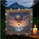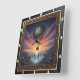 This square wall clock showcases a highly detailed, dimensional illustration of a fantasy landscape, likely inspired by Steampunk themes. A large, ornately designed hot air balloon floats above a spectacular central waterfall. The sky is a dramatic mix of sunset colors and a deep starry night. The foreground features hills covered in colorful, stylized mushrooms. The illustration is framed by an elaborate carved border with bronze scrollwork and small turquoise gems. The artwork is set within a wide, dark outer wood-look frame, which is simulated using high-detail artwork and is not real wood.