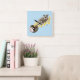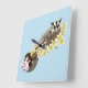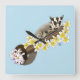 Un lindo planeador de azúcar sentado encima de una rama de árbol con pequeñas flores blancas, amarillas y rosadas por todos lados. El azucarero y las flores se dibujan en un estilo tatuado con un fondo azul