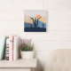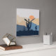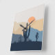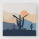 Desierto mexicano al amanecer ilustracion con sol, montañas y cactus decoración en tonos azul marino, naranja, azul y beige sobre fondo gris pastel