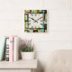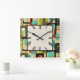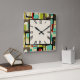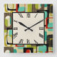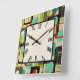 Reloj cuadrado de pared acrílico de 10,75" x 10,75" con una divertida imagen retro de marcos negros, marrones, rojos y mostaza, rectángulos con motivos negros y amarillos y cuadrados turquesa y blanca sobre el bronceado. La crema cuadrada tiene un borde negro y una cara de reloj numérico romano. Ver la colección de Reloj Nifty 50 en DECOR | Sección Relojes. Este producto no está asociado ni afiliado al titular del derecho de autor original.