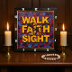 This image features a vibrant and highly textured artwork conveying the spiritual message "WALK BY FAITH NOT BY SIGHT" in bold, raised yellow lettering. The background is composed of a rich, mosaic-like pattern of thick, distinct impasto brushstrokes or blocks of color in shades of red, purple, and blue. This textural interplay creates a dynamic visual effect, making the golden text pop. The overall impression is one of profound faith, artistic depth, and a compelling declaration of spiritual guidance.
