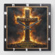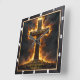 This incredibly powerful and inspiring design captures the theme of Divine Strength through faith. The artwork features a massive, dark Cross inscribed with "THE CROSS," which is dramatically enveloped in brilliant, golden-orange flames and dark smoke, symbolizing trials overcome by Christ's power. A prominent clock motif with dark hands overlays the scene, reminding the observer of the eternal nature of this strength and the enduring power of faith. The design is presented with a high-quality, durable print that creates the striking illusion of a rich, dark wood grain frame surrounding the image, though this border is entirely a visual effect printed directly onto the clock face and is not a separate frame or real wood. The image contains the powerful Bible verse, "I can do all things through Christ who strengthens me. Philippians 4:13." This piece is a powerful reminder of unwavering Christian conviction.