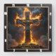 This incredibly powerful and inspiring design captures the theme of Divine Strength and unwavering victory through faith. The artwork features a massive, dark Cross inscribed with "THE CROSS," standing on a rocky base and dramatically enveloped in brilliant, golden-orange flames and huge, billowing smoke clouds, symbolizing the spiritual conviction that overcomes the darkest trials. A prominent clock motif with dark hands overlays the scene, reminding the observer of the eternal nature of this strength and the conquering power of belief. The design is presented with a high-quality, durable print that creates the striking illusion of a rich, dark wood grain frame surrounding the image, though this border is entirely a visual effect printed directly onto the clock face and is not a separate frame or real wood. The image contains the powerful Bible verse, "I can do all things through Christ who strengthens me. Philippians 4:13." This piece is an ultimate reminder of Christian conviction.