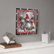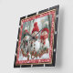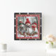 This appealing square wall clock showcases a festive winter illustration of three snowmen standing in a soft, snowy forest setting. The snowmen are adorned with colorful red and green knitted hats and scarves. Bold, decorative script reading "Merry Christmas" anchors the bottom of the image. The inner illustration is surrounded by a vibrant, textured red border that evokes the look of shattered or cracked ice. This entire decorative print is housed within a wide, dark outer wood-look frame, which is simulated using high-detail artwork and is not real wood.