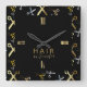 Diseño de reloj de pared personalizado y elegante para estilistas con un patrón de tijeras de oro y plata falsas sobre un fondo negro. El texto es totalmente personalizable.