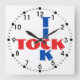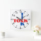 Aquí hay un diseño de reloj de patrón rojo y azul para cualquier casa o pared de oficina. Esta liviana cara de reloj acrílico de pared tiene una contemporánea palabra azul "Marcar" y la palabra roja "Golpe" en una tipografía de estilo crucigrama sobre un fondo blanco. El diseño incluye un anillo exterior de elementos negros y un anillo interior de números negros.