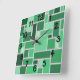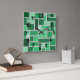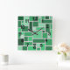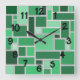 Este reloj de pared tiene un diseño Bauhaus de rectángulos formados con líneas grises llenas de diferentes tonos de verde.