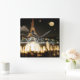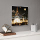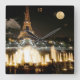 La vista clásica desde el Palacio de Chaillot por la noche. La torre se encuentra detrás de fuentes luminosas y una inmensa luna baja.