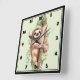 Un reloj con un diseño de acuarela adorable con un manto adorable colgando de una rama de árbol rodeado de hojas tropicales verdes. Fondo verde oliva claro.