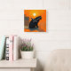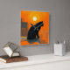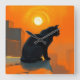 Un gatito negro y elegante encaramado sobre una silueta en la azotea contra un cielo naranja. La puesta de sol arroja un resplandor cálido y dorado, creando un sorprendente contraste con la piel oscura del gato. La mirada tranquila pero atenta del felino insinúa una narrativa misteriosa, mientras se estudia el apacible paisaje urbano de abajo.