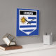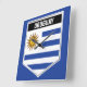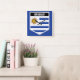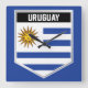 The national flag of Uruguay is infused into a hand drawn shield shape, and set above the flag is the country name.
