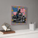 Un jinete en motocicleta, vestido de cuero, avanza con la bandera estadounidense ondeando orgullosamente en el fondo, encarnando la libertad y la aventura.