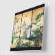 Magnífica pintura en pantalla japonesa de bellas cosechas de doves de luto y otras aves con flores de rosa pálido, rosa rojo y glicinia con nubes y una cascada o chorro de agua está en este reloj de pared. La imagen es de dominio público debido a derechos de autor vencidos.