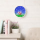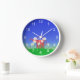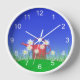 Reloj de pared con mi diseño original de una lata de agua roja y margaritas brillantes con un cielo azul y hierba verde.