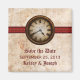 Este reloj antiguo Save the Date Magnet presenta una pieza vintage destacadamente centrada en la parte superior de una metalizado cadena de bolas y un elegante borde rojo rayado. El aspecto angustiado del fondo de textura de papel grueso completa el ambiente anticuado de este diseño único. Este offbeat ahorra el imán de fecha perfecto para anunciar su boda de inspiración vintage o steampunk. Fácil de personalizar, simplemente añada los detalles de su boda en los espacios proporcionados. Haga clic en "Personalizar" para encontrar opciones adicionales para personalizar este diseño.