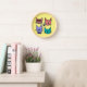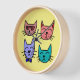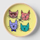 Para los amantes de los gatos, estos son cuatro caras graciosas y locas de gato con un color diferente en un fondo amarillo.