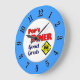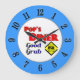 Esta cocina dice que el reloj dice "Diner" del Pop buen grub en letras retro rojas y azules con una hamburguesa en amarillo. Los números son negros en una cara exterior azul. Un restaurante retro que anuncia el tema del arte para ti o para tu cocinero de corto orden favorito. Haga clic en Personalizar para cambiar los colores de fondo y más.