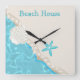 Los relojes de la pared de la cocina temática de la playa están diseñados con una imagen gráfica de la arena de la playa, una concha de vieiras y una estrella de mar con agua de marea en un resumen de una escena costera. Creado para una casa de playa o para cualquier decoración de casa que pueda utilizar un diseño náutico.
