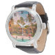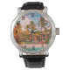 El reloj de cuero negro de los hombres para proporcionar un registro constante del tiempo que es una mercancía valiosa para la gente ocupada y seria. Su diseño es elegante y representa la escena de un hotel de playa tropical, con árboles y puesta de sol. Se puede dar como regalo.