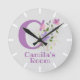 Reloj de dormitorio para niños. El diseño presenta Monograma y Nombre con Flores a cada lado en un color pastel de agua. El nombre de ejemplo es Camila. Cambie el nombre como desee para cualquiera con un nombre que comience por C.