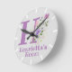 El diseño presenta Monograma y Nombre con Flores a cada lado en un color pastel de agua. El nombre de ejemplo es Henrietta. Reloj de dormitorio para niños. Cambie el nombre como desee para cualquier persona con un nombre que empiece por H.