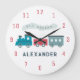 Este lindo reloj de tren de vapor "all aboard" para habitación de niños/guardería presenta el nombre del niño sobre un fondo blanco con tren de vapor en azul y rojo. Personalízalo según tus necesidades. Puedes encontrar productos coincidentes en mi tienda.