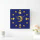 ¡Éste es tal bonito y reloj caprichoso! Su fondo es azul de medianoche profundo, y en el centro es un ilustracion de la luna, con una estrella colgando de él. Los números se acentúan con hacer juego las estrellas. Cuelgúelo en la biblioteca, la guarida, el cuarto de niños, o la oficina. Este reloj haría un regalo único del estreno de una casa. Disponible en dos tamaños del reloj redondo, o un reloj cuadrado. Diseño de Copyright Scarebaby.