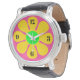 Los años sesenta Groovy observan con flores amarillas y verdes sobre fondo rosado. Los colores enfrentados fueron toda la rabia en los años 60. Grandes números en 12, 3, 6 y 9 para una lectura fácil. Estar preparados para mostrar este reloj porque es original, sobre todo porque los años 60 eran hace mucho tiempo.