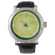 Fotografía de un trozo de cal centrado en el fondo verde (personalizable) del reloj.