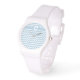 Un reloj de pulsera elegante y deportivo con una correa de silicona blanca para personalizar con tu inicial, y un patrón de chevron en la tendencia Dusk Blue y White.